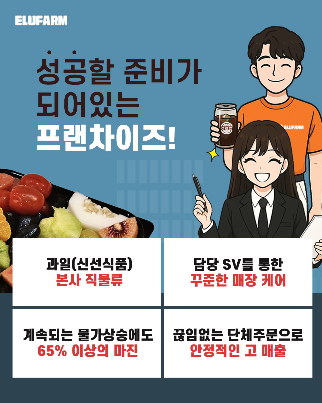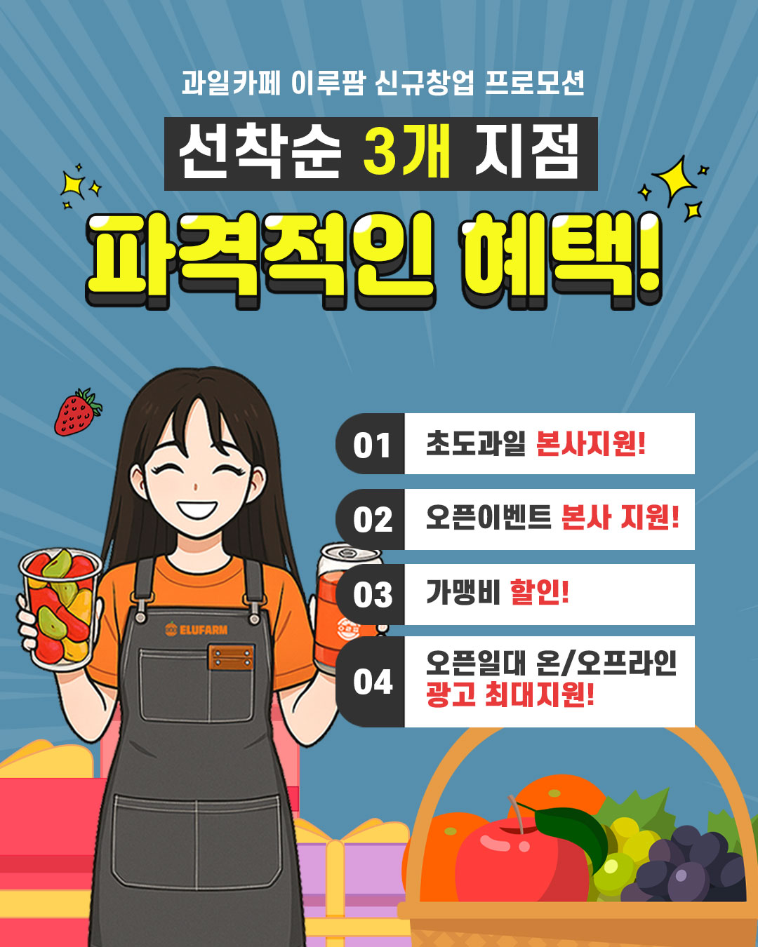 오픈 / 홍보 | 오픈 시 홍보물 명함, 유니폼, 각종 과일모형, 스티커 제공 | 120만원 | |